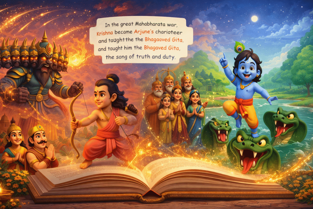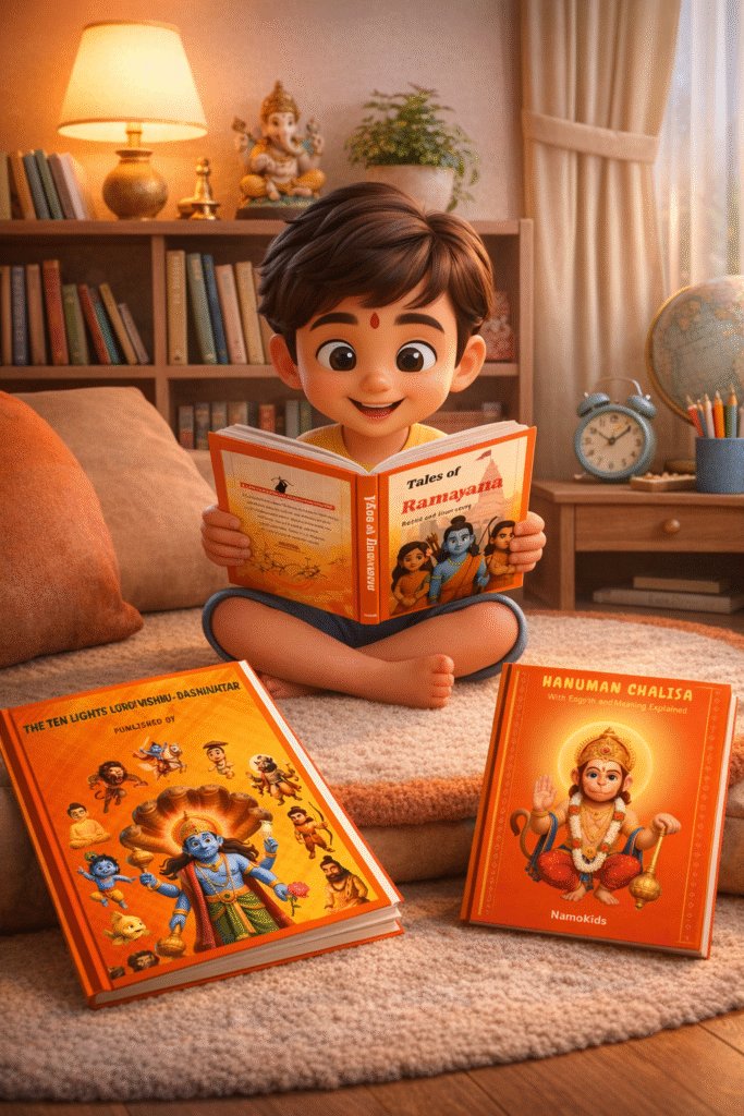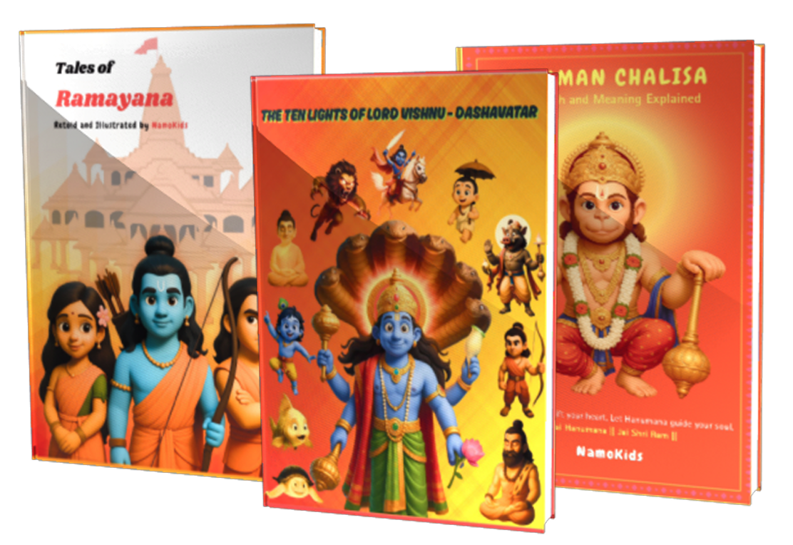 EXPLORE THE COLLECTION EXPLORE THE COLLECTION Timeless Hindu stories brought to life for young hearts Stories That Shape Character & Culture TaLEs of Ramayana Courage, kindness, and virtue in every page. for just INR 1899 ADD TO CART Lord Vishnu Avatars Wisdom and lessons from the divine. for just INR 1699 ADD TO CART Hanuman Chalisa Strength and positivity for growing minds. for just INR 693 ADD TO CART for Set of all three Books Get all three books today and gift your child a journey into heritage. for just INR 2999 ADD TO CART Your child journeys with heroes of our rich heritage. Let their adventure begin → Cultural Roots Wisdom and lessons from the divine. Engaging & Fun Stories children love to read again and again. Character Development Lessons that last a lifetime. Beautiful Illustrations Every page is a visual delight. Testimonials Join hundreds of happy families Get all three books today and gift your child a journey into heritage. Get the Complete Set → “Limited-time offer – bring home the magic now!” Nurture values, imagination, and love for Indian roots. Order Now →